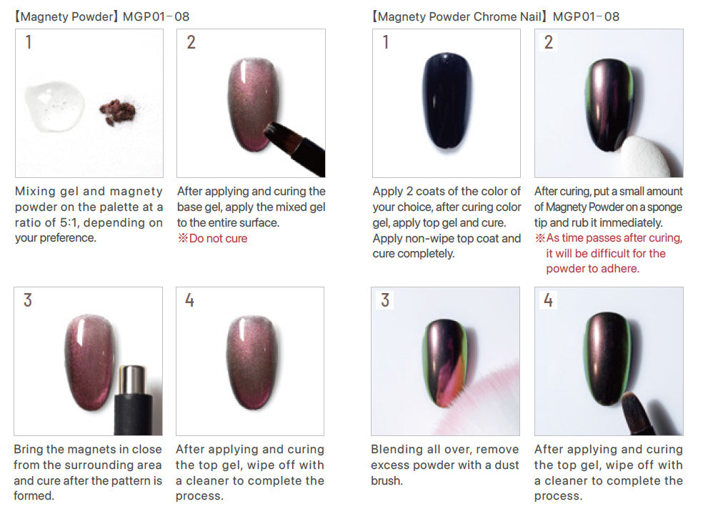| When mixed with mixing clear gel and used with a magnet designed for this purpose, patterns and lines with depth emerge. The shine changes depending on the gel mixed in, and this mysterious powder can also be used as a chrome nail. |